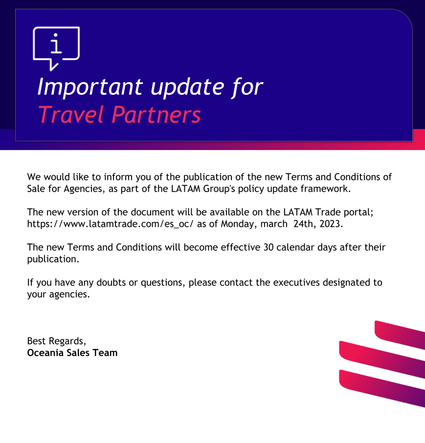 We would like to inform you of the publication of the new Terms and Conditions of Sale for Agencies, as part of the LATAM Group's Policy ...