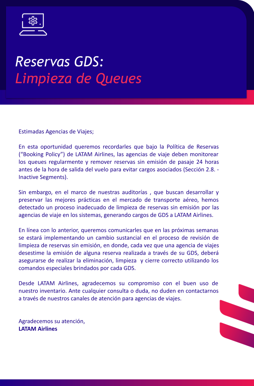 LATAM Airlines refuerza las directrices para la eliminación de reservas no emitidas.