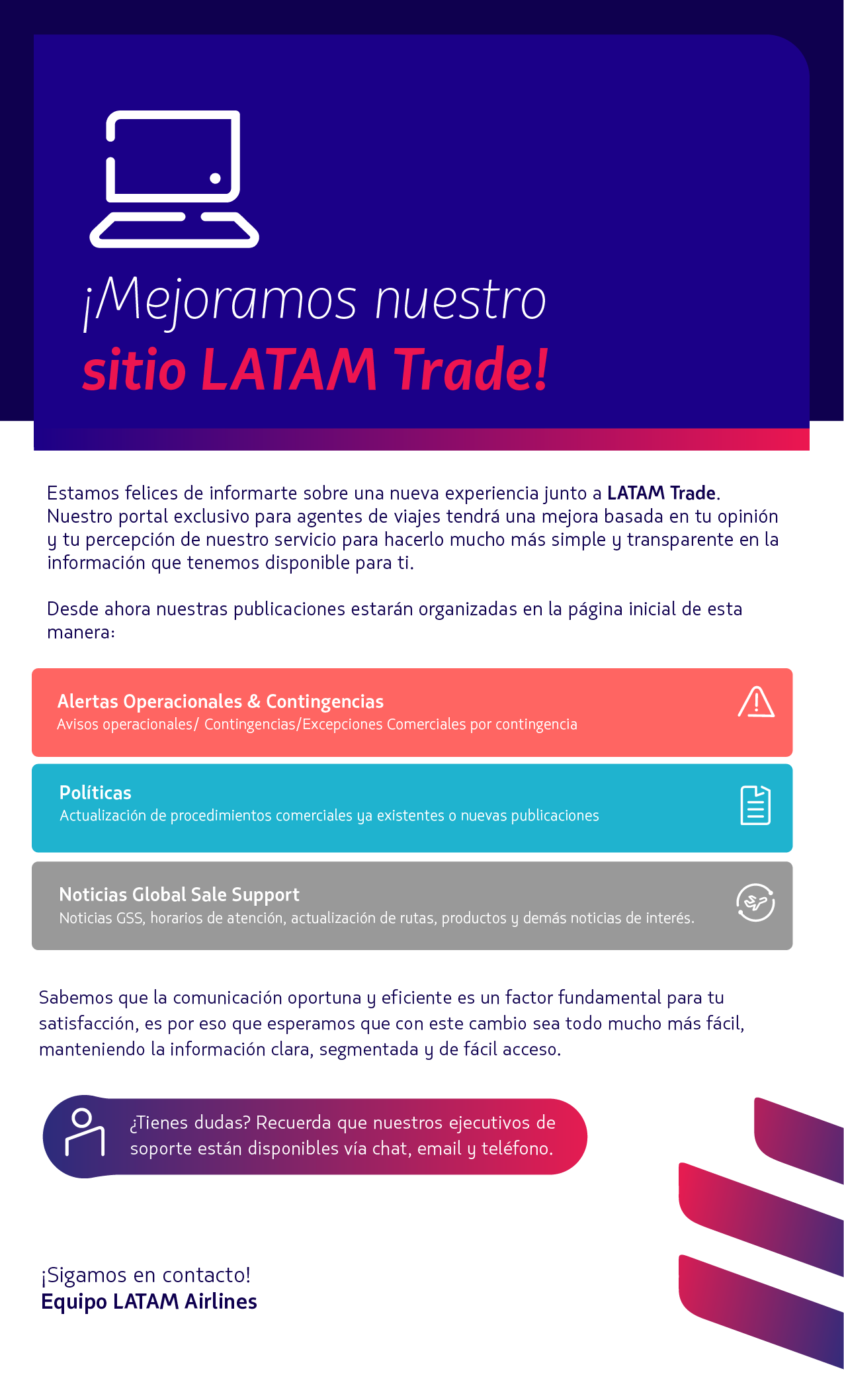 Mantente al día con funcionalidades, herramientas y materiales relevantes para tu operación con LATAM.