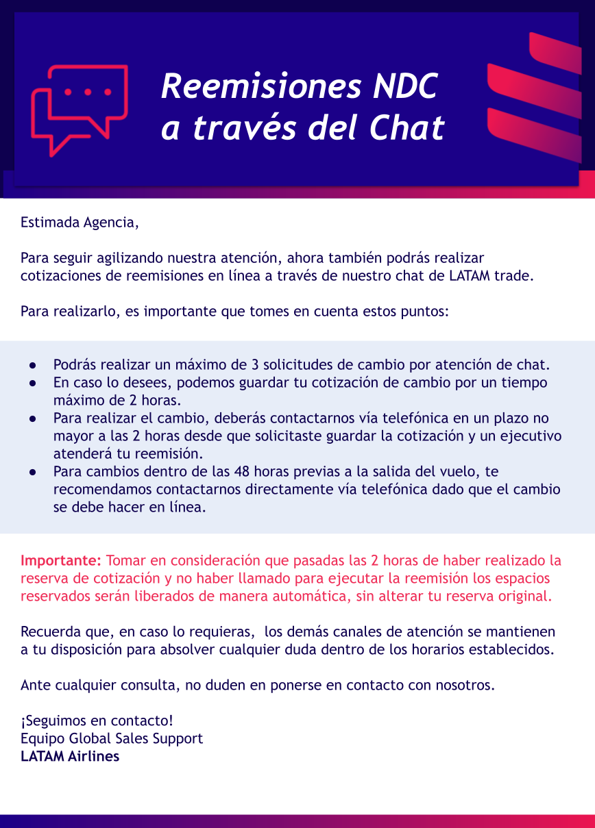 Para seguir agilizando nuestra atención, ahora también podrás realizar cotizaciones de reemisiones en línea a través de nuestro chat de LATAM trade.