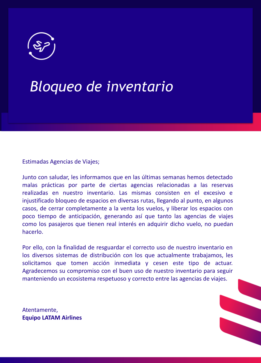 LATAM Airlines advierte sobre malas prácticas de bloqueo de espacios en inventario.