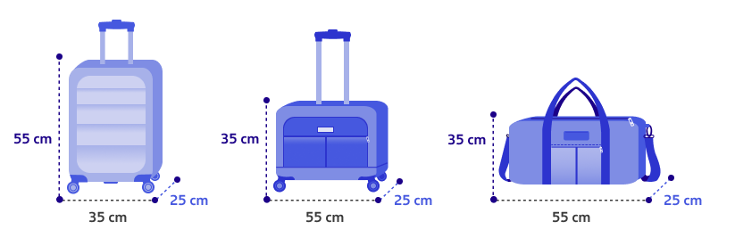 Alto= 55 cm x Largo= 35 cm x Ancho= 25 cm, incluyendo los bolsillos, las ruedas, el asa, etc. (21,7 x 13,8 x 9,8 in).