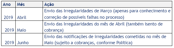 Conforme o cronograma acima, enviaremos individualmente as agências as irregularidades detectadas em Março 2019, com a finalidade de informa-los e que possam corrigir seu processo.