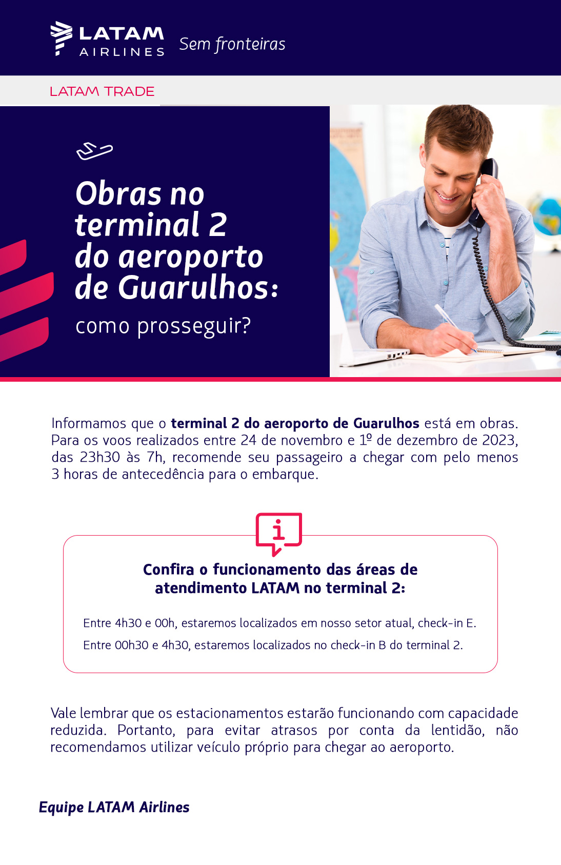 Informamos que o terminal 2 do aeroporto de Guarulhos está em obras. Para os voos realizados entre 24 de novembro e 1º de dezembro de 2023, das 23h30 às 7h, recomende seu passageiro a chegar com pelo menos 3 horas de antecedência para o embarque.