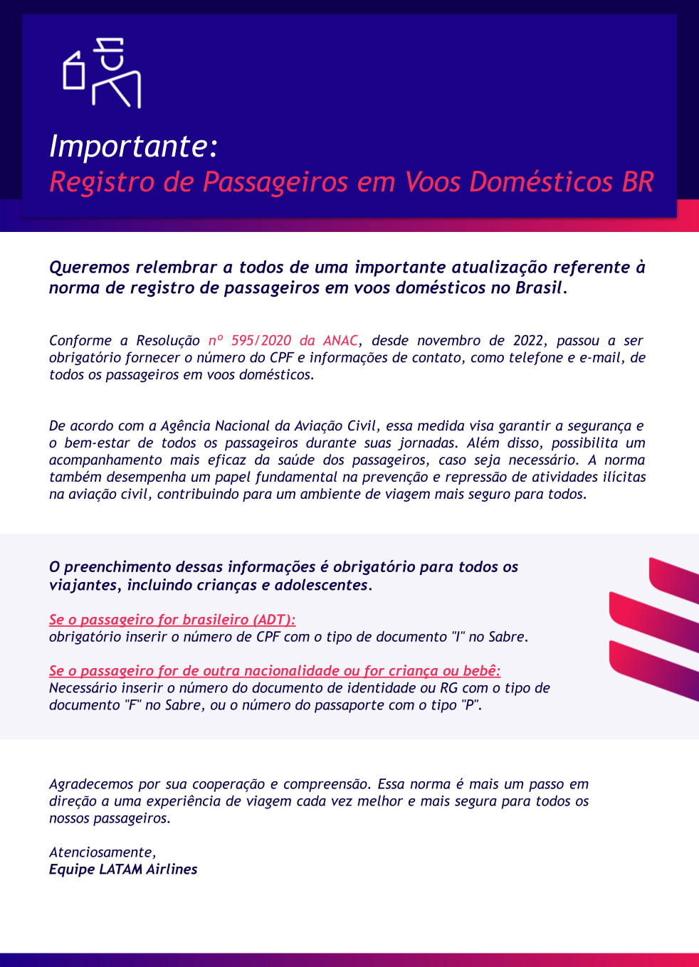 Conforme a Resolução nº 595/2020 da ANAC, desde novembro de 2022, passou a ser obrigatório fornecer o número do CPF e informações de contato de todos os passageiros em voos domésticos no território brasileiro.