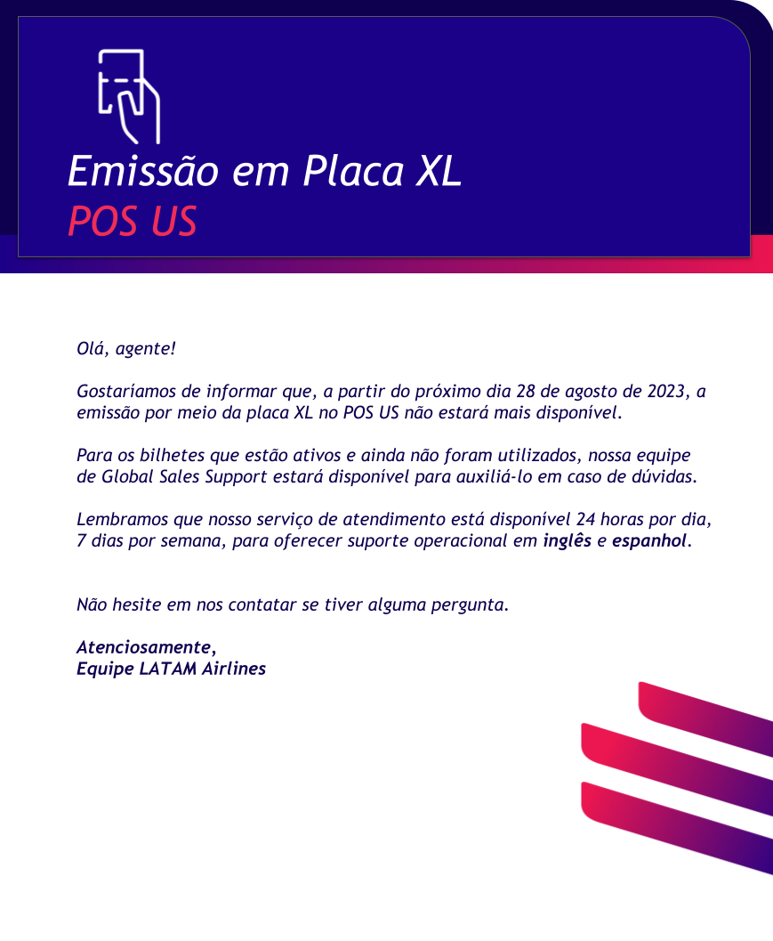 Gostaríamos de informar que, a partir do próximo dia 28 de agosto de 2023, a emissão por meio da placa XL no POS US não estará mais disponível.